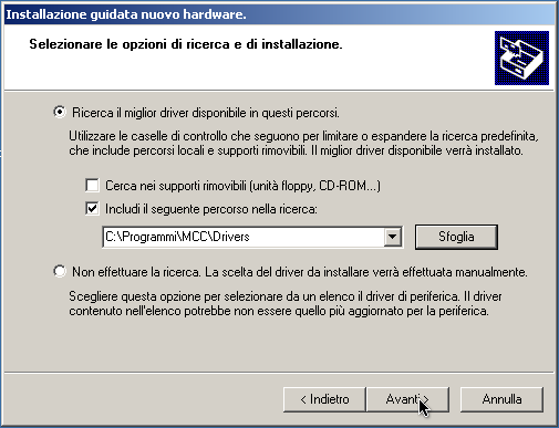 Figura 2.23. La procedura di installazione del driver ora mostra il dialogo per la ricerca dei file necessari all'installazione. Selezionare “Includi il seguente percorso nella ricerca” e indicare nella casella sottostante il percorso dei driver “C:\Programmi\MCC\Drivers”; a questo punto premere il pulsante Avanti.