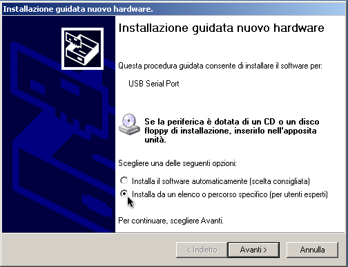 Figura 2.12. Comparirà una finestra per avviare la procedura guidata di installazione dei driver, è importante selezionare l'opzione “Installa da un elenco o percorso specifico (per utenti esperti)” e dopo premere il pulsante Avanti.